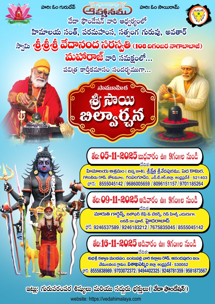 తేది 16-11-2025 ఆదివారం ఉదయం 9 గంటల నుండి /వేదిక : శుభశ్రీ కల్యాణ మండపం , బంటుపల్లి వారి కల్లాలు, వేములవలస గ్రామం , ఆనందపురం జంక్షన్ , విశాఖపట్నం, ఆంధ్రప్రదేశ్ ఈ మూడు ప్రాంతాలలో అత్యంత వైభవంగా శ్రీ సాయి బిల్వార్చన కార్యక్రమాలను వేదా ఫౌండేషన్ వారి ఆద్వర్యంలో నిర్వహించనున్నారు. అందరూ ఆహ్వానితులే….
